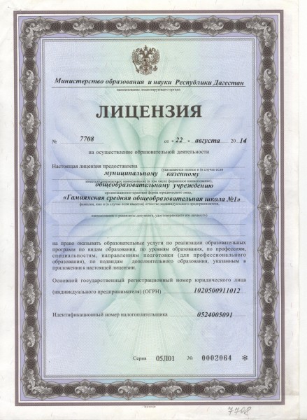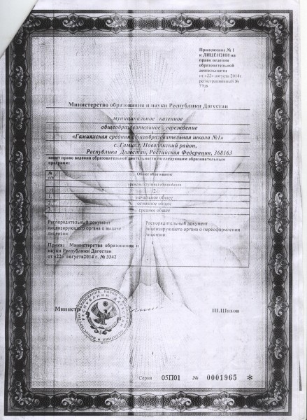 Полное наименование образовательной организации* Муниципальное казенное общеобразовательное учреждение "Гамияхская СОШ № 1"