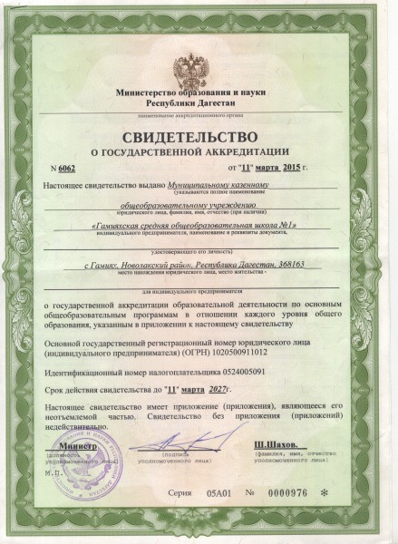 Сокращенное наименование образовательной организации* МКОУ "Гамияхская СОШ № 1"